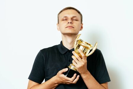 Happy young male intrepreneur or business man holding his gold trophy and celebrating his victory.Studio shot.