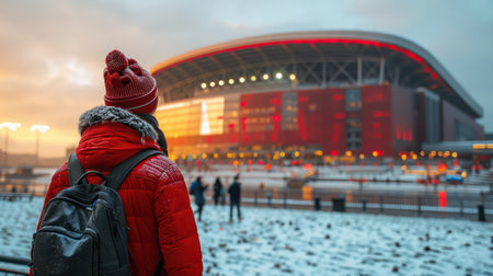 A woman wearing a red coat and a red hat stands in front of a large stadium. The stadium is lit up with red lights, creating a festive atmosphere. The woman is carrying a backpack