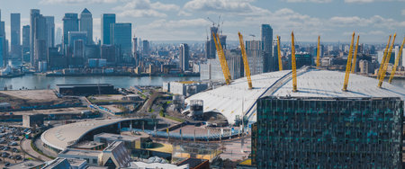 Aerial View of London Featuring O2 Arena and Canary Wharf Skyline
