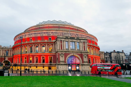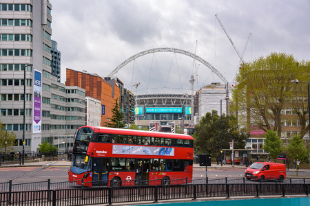 London, UK - April 27, 2018: Red double decker bus in front of the Wembley stadium on the overcast day.