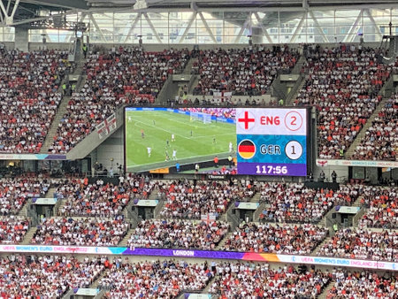 London, UK - March 8, 2018 : The screen in front of New Wembley Stadium shows England and Italy icons on it.