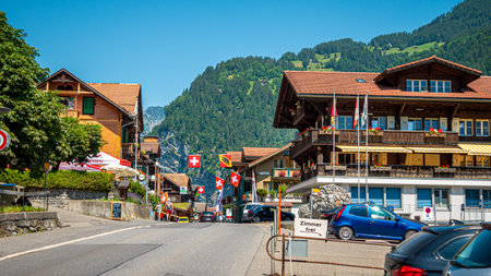 swiss mountain village Lauterbrunnen, Switzerland. Swiss street with hotels.