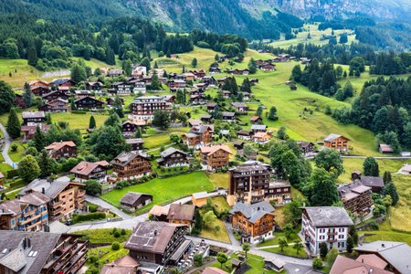 View on swiss alpine village Wengen and the cliffs of the Lauterbrunnen valley under cloudy skies in morning in summer