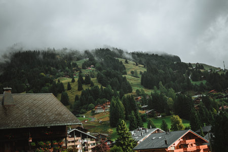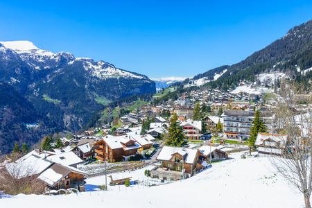 Small village in Switzerland. Traditional swiss landscape. Alps mountains in Switzerland. Hot sunny day