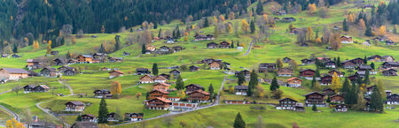 Swiss Alps, Jungfrau Region, Wengen, Switzerland town aerial autumn view