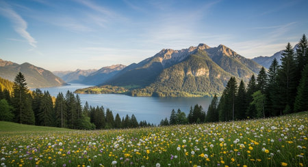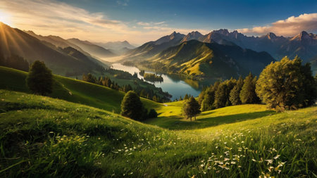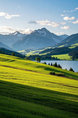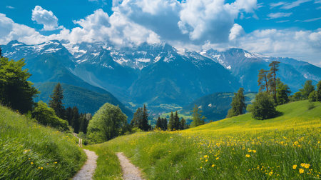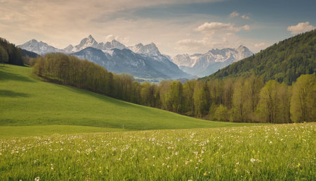 Panoramic view of idyllic mountain scenery in the Alps with fresh green meadows in bloom on a beautiful sunny day in springtime