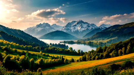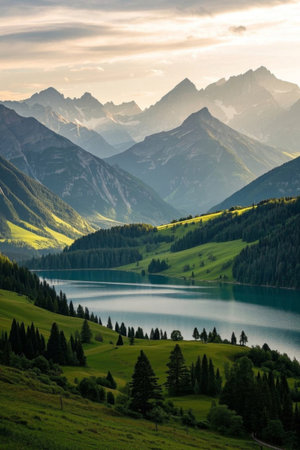 Beautiful mountain landscape with lake and meadow at sunset time.