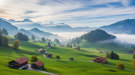 Panoramic view of the Swiss Alps and meadows. Switzerland