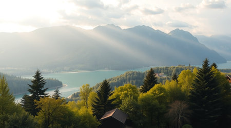 Beautiful countryside Aerial morning 180 grad panorama view on Attersee lake im Salzkammergut alps mountains by in Nussdorf, Zell am Attersee. Upper Austria, nearby Salzburg.