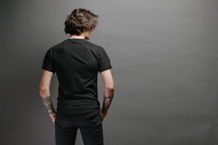 Silhouette of a guy in a dark T-shirt and bandana in back modeling light on a black background. View of a man from the back. Copy space. Isolated.