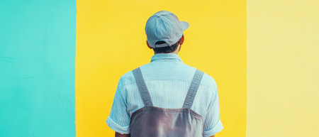 A man in a cap and overalls faces a vibrant yellow and turquoise wall showcasing artistic expression in an urban setting during daylight.