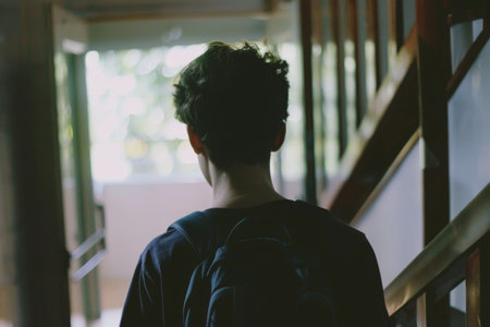 A silhouette of a black young boy with a school backpack next to contrasted stucco wall.