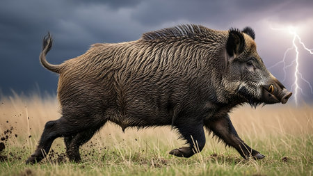 A boar runs in a field during a storm.