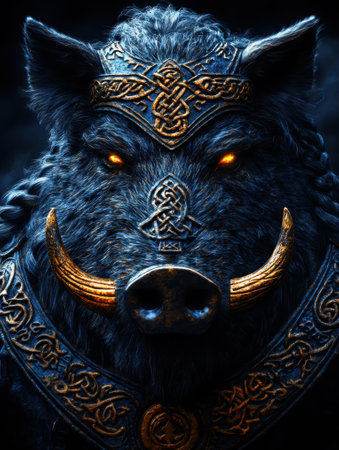Mythical Armored Boar - Fantasy Creature with Glowing Eyes - Digital Art for Posters and Game Design