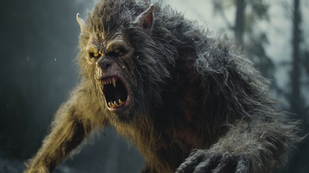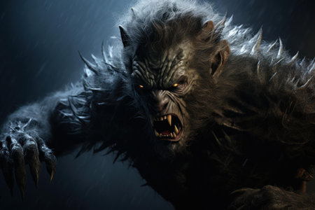 Terrifying werewolf snarling aggressively amidst a stormy night