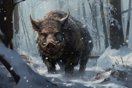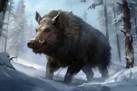 Digital painting of a wild boar walking through a snowy forest during winter