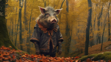 Majestic Wild Boar in Autumn Forest with Golden Leaves and Soft Lighting AI Generative