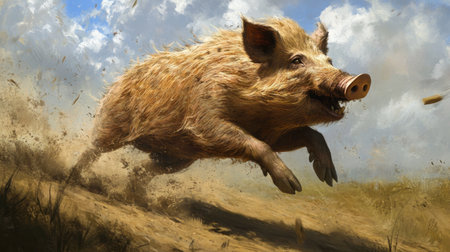 A wild boar captured mid-run in a vibrant natural setting, showcasing its powerful build and dynamic movement, surrounded by earthy tones and scenic beauty.