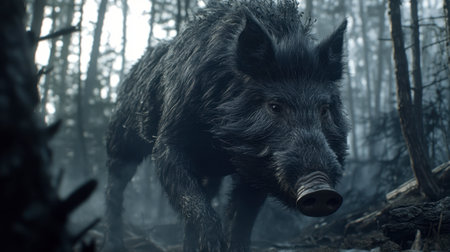 A stunning wild boar navigates through a dark and mysterious forest, showcasing the beauty and raw power of wildlife in its natural habitat.