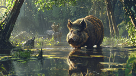A wild boar wades through a tranquil forest setting, reflecting in the water. The scene captures the serene beauty of wildlife in its natural habitat.