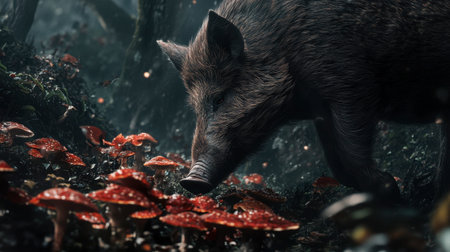 A wild boar explores a mystical forest floor scattered with vibrant red mushrooms, creating a captivating scene of wildlife and enchanting nature.
