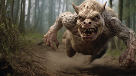 an angry werewolf, rendered in the hyper-realistic style of unreal engine 5, is seen running down a road. the detailed rendering showcases the meticulous linework precision, capturing the dark gray and gold tones of the creature. the image is captured using the angenieux 45-90mm f/2.8 lens, adding to the overall realism. ai generated