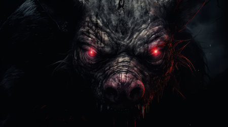 a terrifying demonic pig with red eyes and a grin of pure evil stares directly at you. the grainy quality of the photo adds to the eerie atmosphere, as if it was taken from a distance back. ai generated