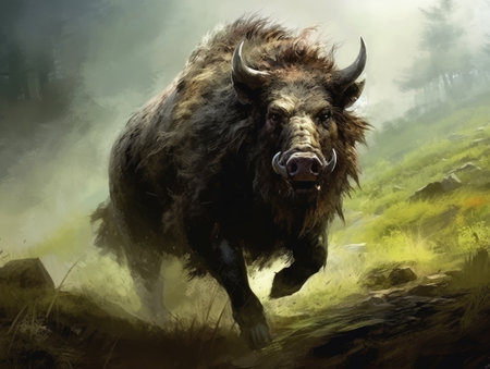 the boar, depicted in a detailed sketch, showcases its fierce features, from the curved tusks to the coarse bristles on its back, capturing the essence of this powerful wild animal, commonly found in european forests, and highlighting its robust build and aggressive demeanor. ai generated