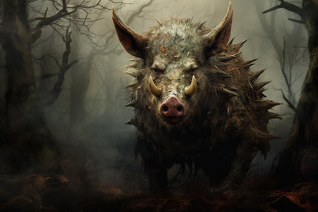 A captivating wild boar stands alone in a dark forest at night, surrounded by mist and shadows, evoking a sense of mystery and enchantment in nature.