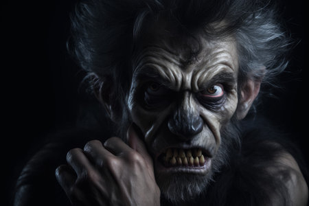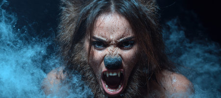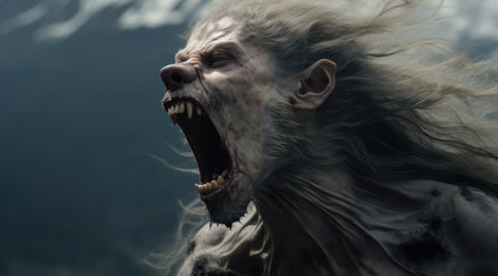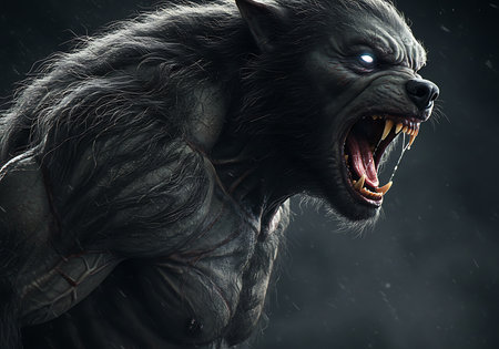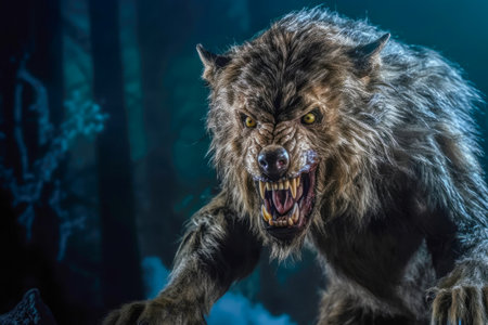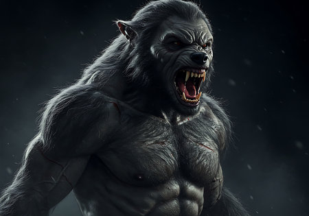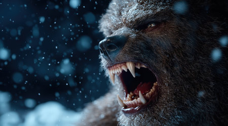 Ferocious werewolf up close, with ntricate details of its menacing features - sharp fangs, piercing eyes, and untamed fur. Raw power and unnerving beauty of mythical creature. Generative AI.