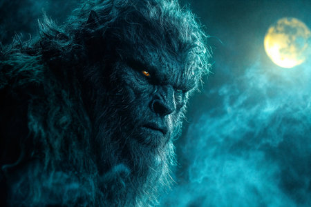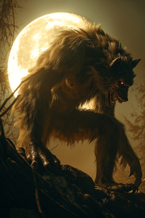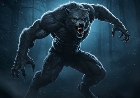A werewolf stands in a moonlit scene, embodying mystery and power in a dark forest