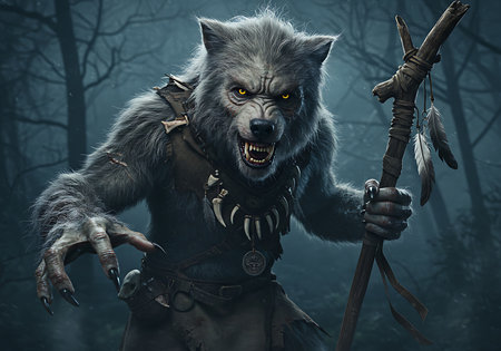 A digitally rendered, imposing werewolf figure, clad in primitive, ornate attire adorned with bones, furs, and feathers, stands menacingly in a misty forest. Generative Ai