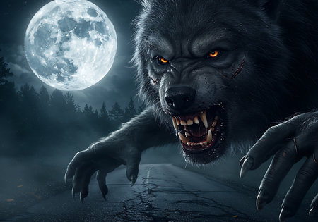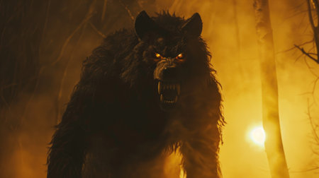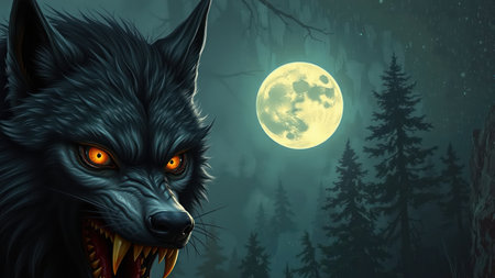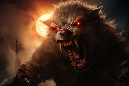 A menacing werewolf with glowing eyes and sharp teeth stands under a full moon in a dark, eerie forest. AI generation
