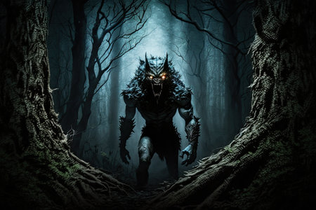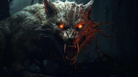 scarywerewolf lurking in dark forest, ready to pounce, created with generative ai