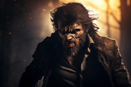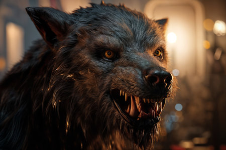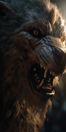Werewolf close-up. Ferocious spine-chilling mythical beast with sharp fands, glowing eyes and untamed fur. Generative AI.