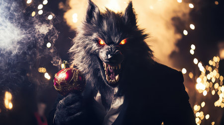 A wolf like creature wearing a suit holds a Christmas ornament amidst sparks and lights creating a festive yet eerie atmosphere.