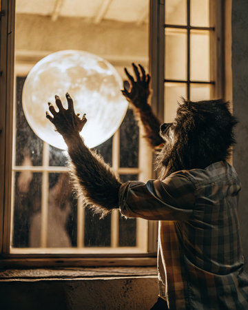 a Hairy werewolf growling in the moonlight over a full moon shining on a dark scary mystery foggy forest with a gothic house under the moon.