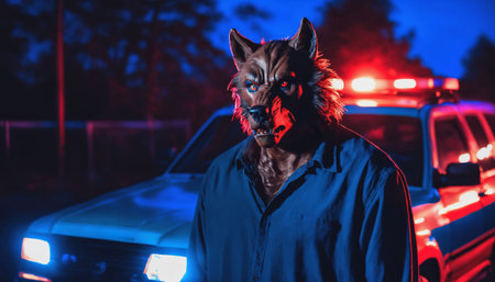 photo of criminal suspect werewolf lycanthrope in crime scene standing in front of police car at night and red blue light, generative AI