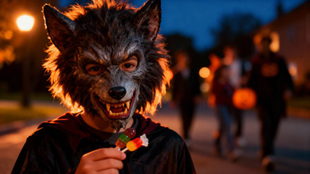 A young boy dressed in a wolf mask costume is holding candy while trick-or-treating on Halloween. Other children are in the background.