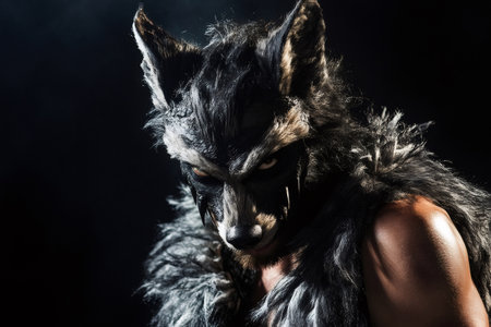 Actor wearing realistic wolf mask and fur costume posing on dark background for a Halloween themed photoshoot