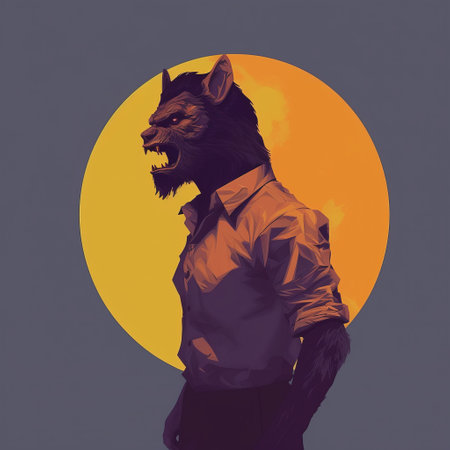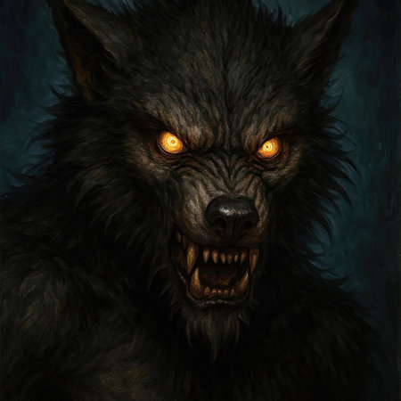 Intense image of a werewolf with glowing eyes amidst dark, moody lighting