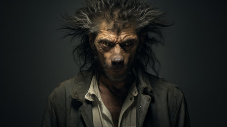 a monster werewolf with explosive pigmentation stands on a grey screen, captured in the style of backlit photography with a white background. this national geographic photo showcases the detailed costumes and digitally enhanced features of the creature. shot using a canon 50mm f095 lens. ai generated
