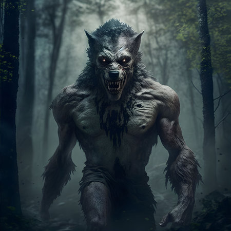 An AI generated illustration of a menacing werewolf creature in a natural forest setting