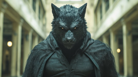 Menacing werewolf with glowing eyes, wearing a dark cape, standing in a monumental building