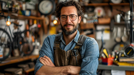 Confident bike mechanic in shop wearing glasses arms crossed smiling proudly. Concept Mechanic, Bike shop, Confidence, Glasses, Smiling