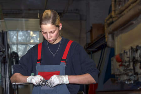 Gender equality. Portrait of a young woman in uniform, working in a workshop, which writes down orders on a piece of paper. In the background is a blue wall and a table with spare parts for the car.