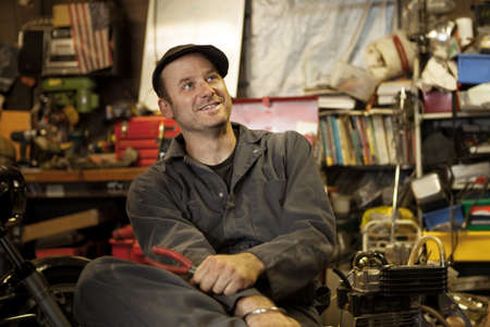 Portrait of mechanic man wearing jeans and cap standing in front of workbench in motorbike workshop