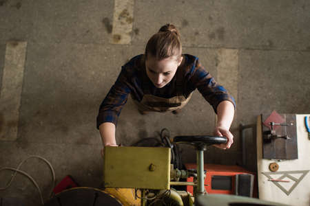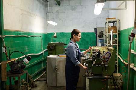 Concentrated middle-aged brunette woman in safety goggles performing turning operation on lathe in dirty factory shop