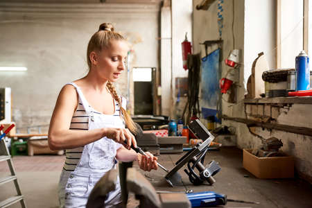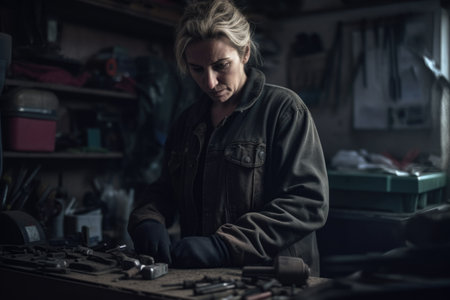 Female Caucasian Middle aged fixing appliances in garage workshop. Generative AI AIG23.