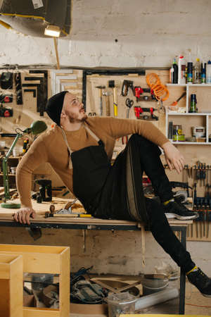 Chilly carpenter in a watch cap sitting on a work table, in a big workshop. Number of tools hanging on the wall.